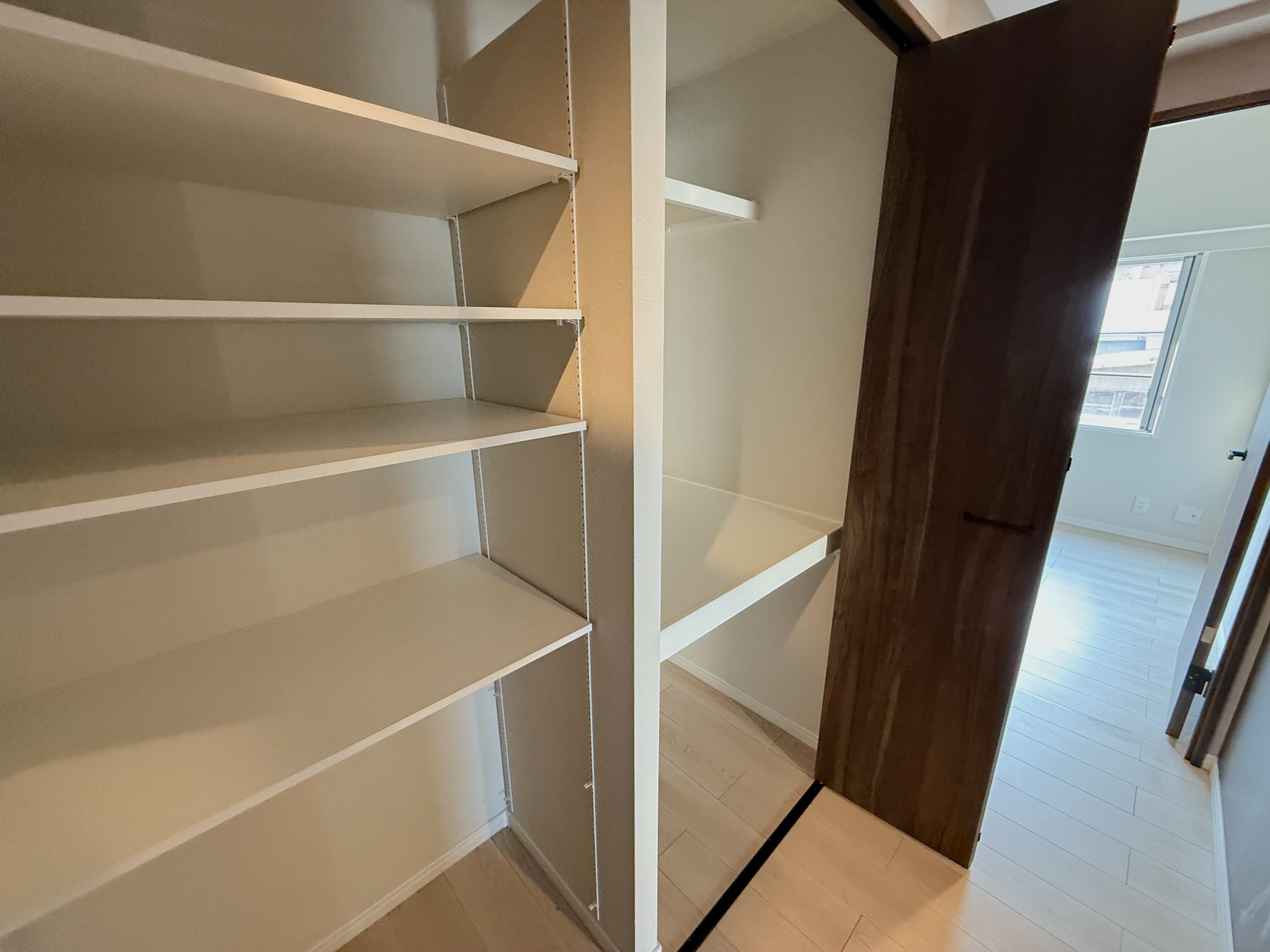 各洋室約6帖にはクローゼット、洋室約7帖にはウォークインクローゼットがございます。収納内容によって変えられる可動棚付の大型廊下収納もあり、収納豊富です。