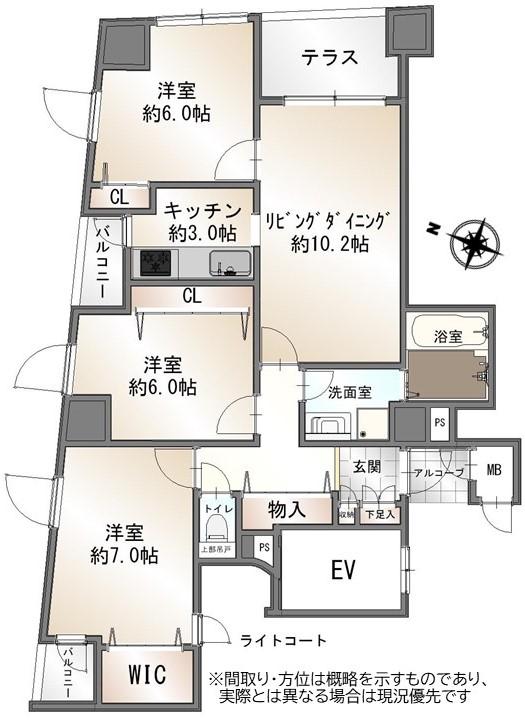各居室6帖以上のゆとりある3LDKです。角住戸につき、LDに面したテラスに加え、バルコニーも2ヵ所ございます。キッチンにはバルコニーへ繋がる勝手口があり、通風・採光が取れ、家事動線も良好です。