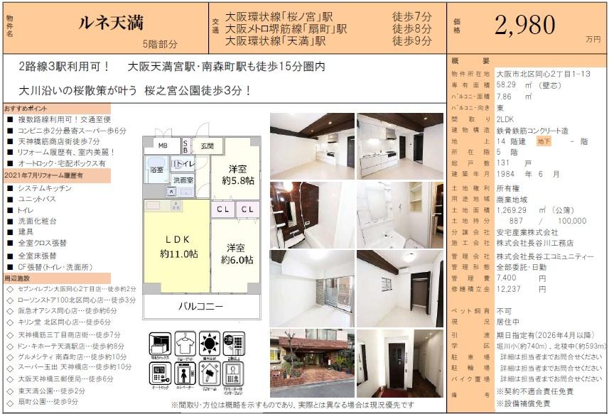 <大阪環状線・大阪メトロ2路線3駅利用可、大阪天満宮駅・南森町駅歩15分圏>リフォーム履歴有、室内美麗。大川沿い路歩3分!コンビニ歩2分、スーパー歩6分、天神橋筋商店街歩7分!ぜひお問合せください。