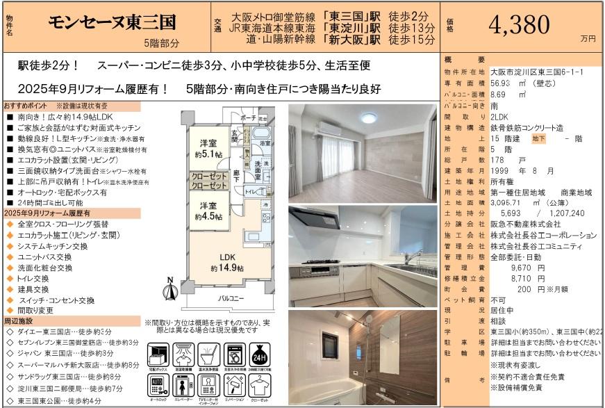 2沿線利用可能!最寄駅・大阪メトロ御堂筋線「東三国」駅徒歩2分、好立地の分譲マンションです。南向きバルコニーにつき陽当たり良好。2025年9月リフォーム履歴有、綺麗な水回り。